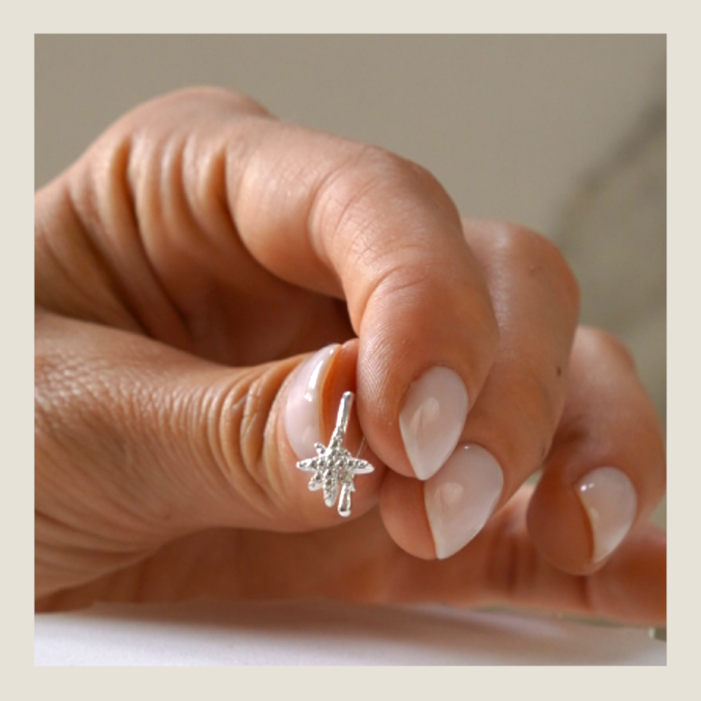 Aro con estrella de brillos delicados que cuelga liviana y enmarca la cara con luz. Si buscás una pieza que sume brillo sin exagerar, este diseño te acompaña en esos días en los que querés que tu energía se note.