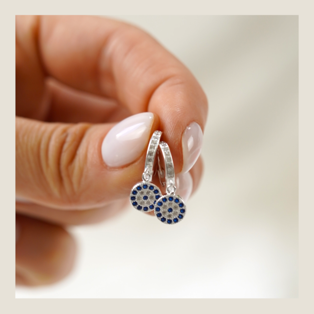 Aritos argolla con dije circular tipo ojo en tonos azules. Si buscás una pieza que hable de protección y claridad, estos aros te acompañan como un pequeño ritual de luz diaria.