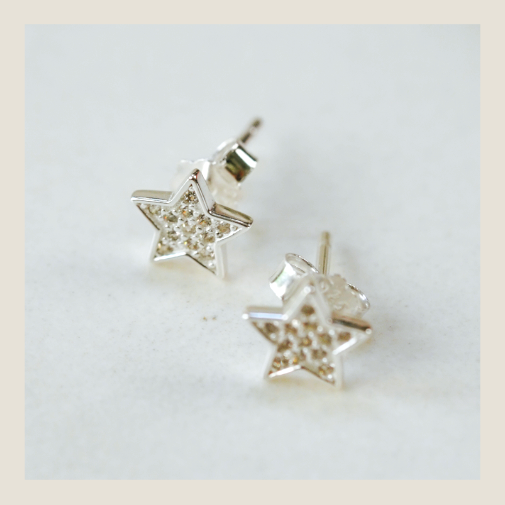 Aros estrella con pequeños puntos de luz en la superficie. Ideales si te gusta que el brillo acompañe tus gestos y se note de cerca, manteniendo siempre una sensación de sutileza y suavidad.