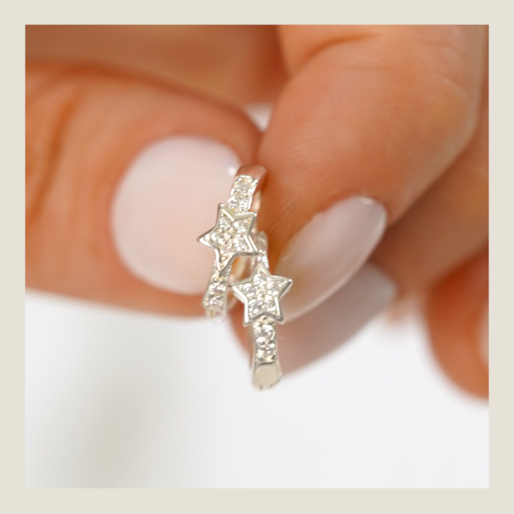 Argollas finas con estrella de brillo delicado al frente y pequeños puntos de luz en la argolla. Una pieza sutil que suma un toque de cielo y realza tu resplandor sin exagerar.