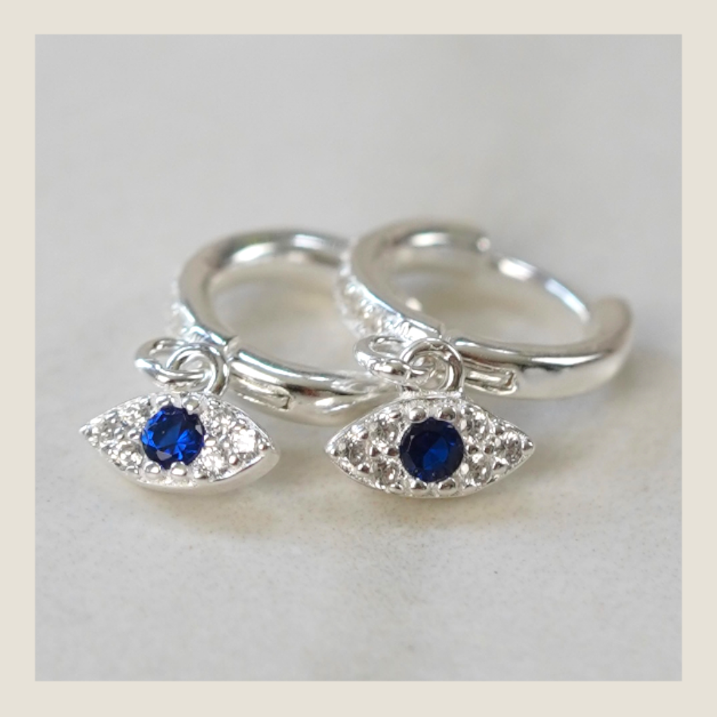 Aros argolla pequeños con dije de ojo turco cubic azul. Un talismán moderno que te acompaña todos los días, recordándote tu intuición y la energía que elegís activar cada mañana.