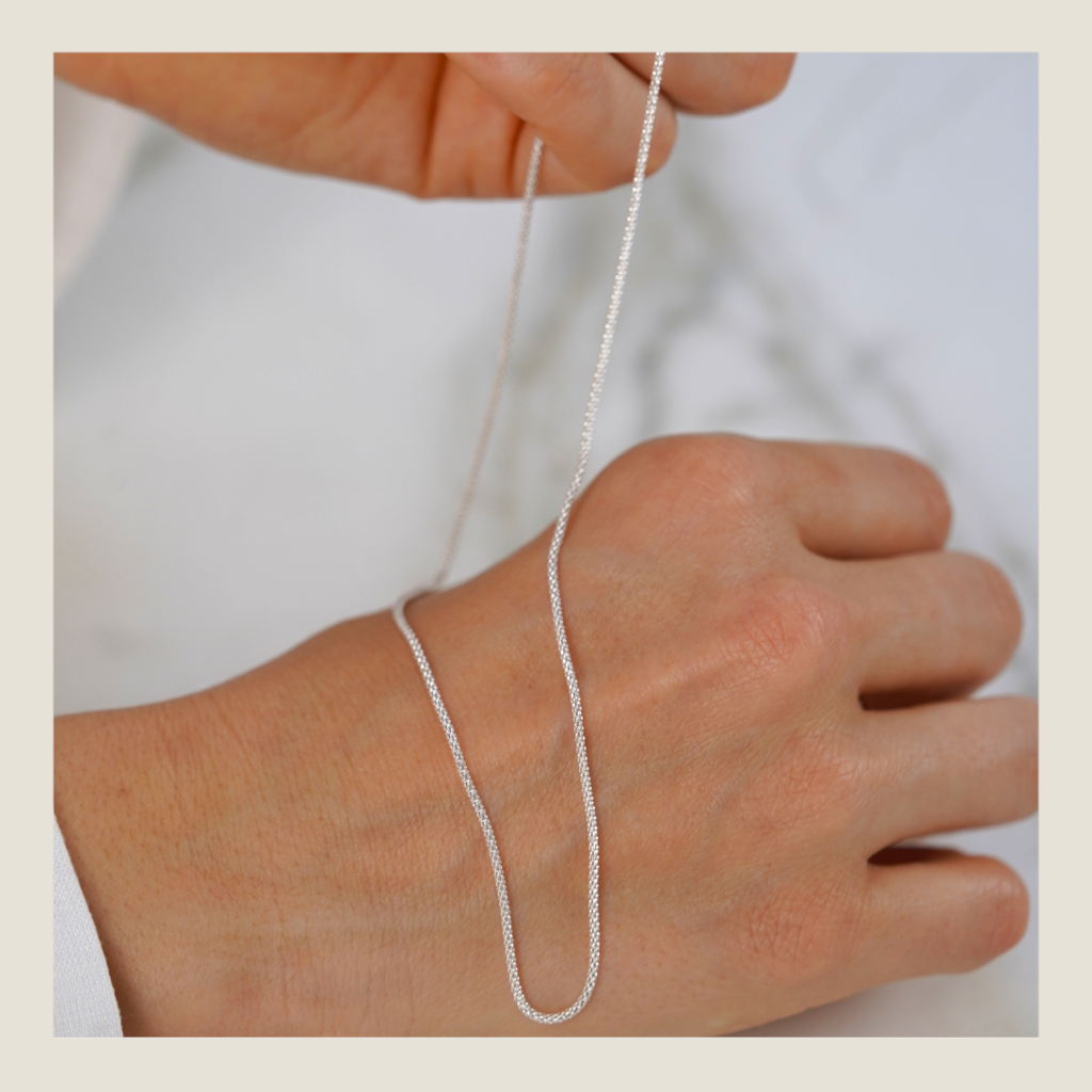 Cadena de eslabón simple y alargado. Pensada para acompañar tu día a día como una línea de calma y claridad sobre la piel.