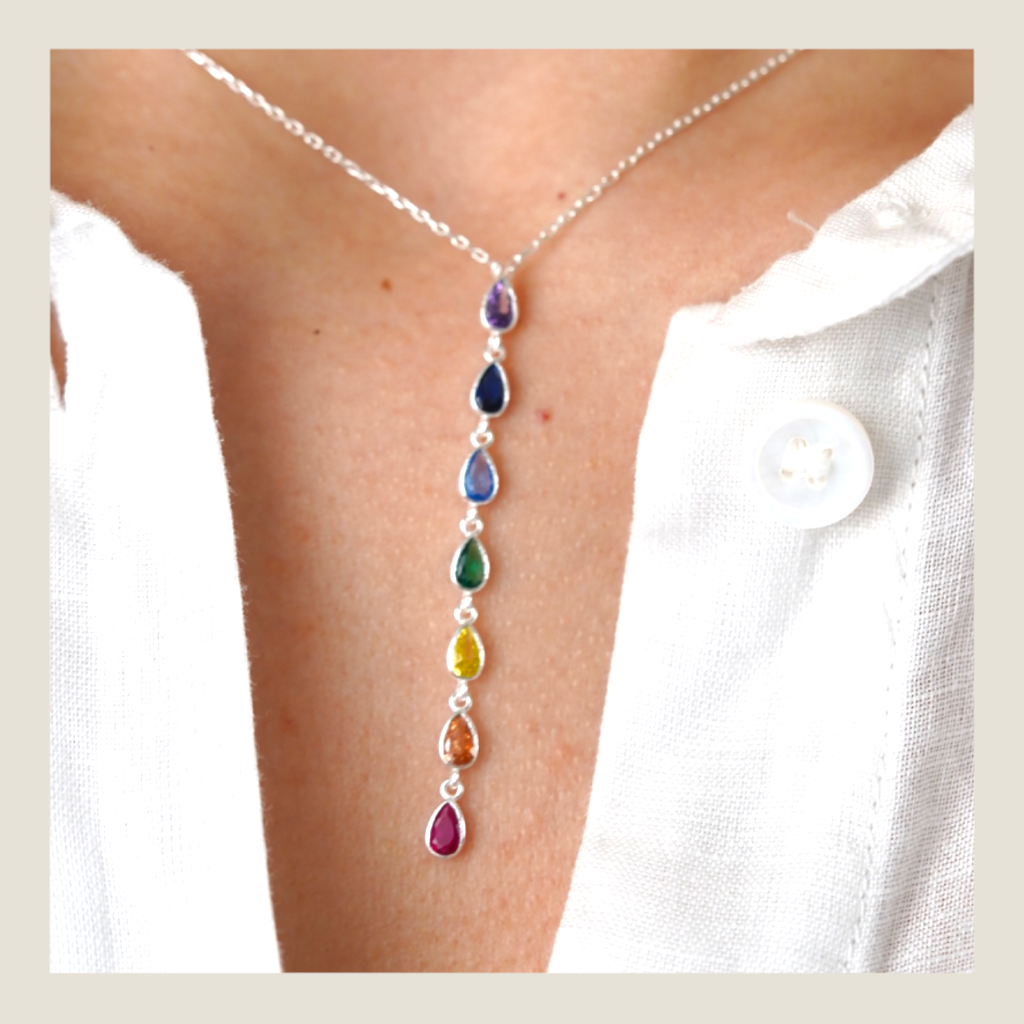 Collar con colgante alargado de gemas en degradé de color. Acompaña el movimiento de tu día y se convierte en una guía sutil, ideal si buscás una pieza que te recuerde ir paso a paso siguiendo tu propia luz.