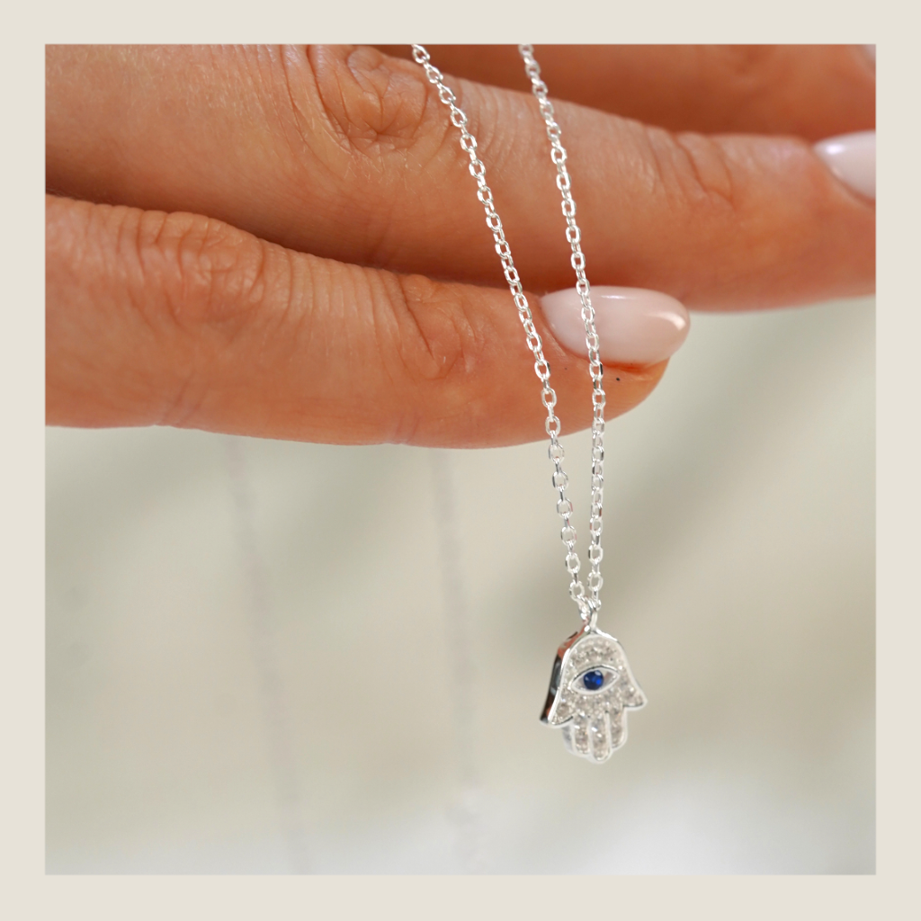 Collar con dije de mano protectora y detalle de brillo en el centro. Si buscás un símbolo que te recuerde tu propia fuerza y tu intuición, este collar se convierte en un compañero diario cargado de intención.