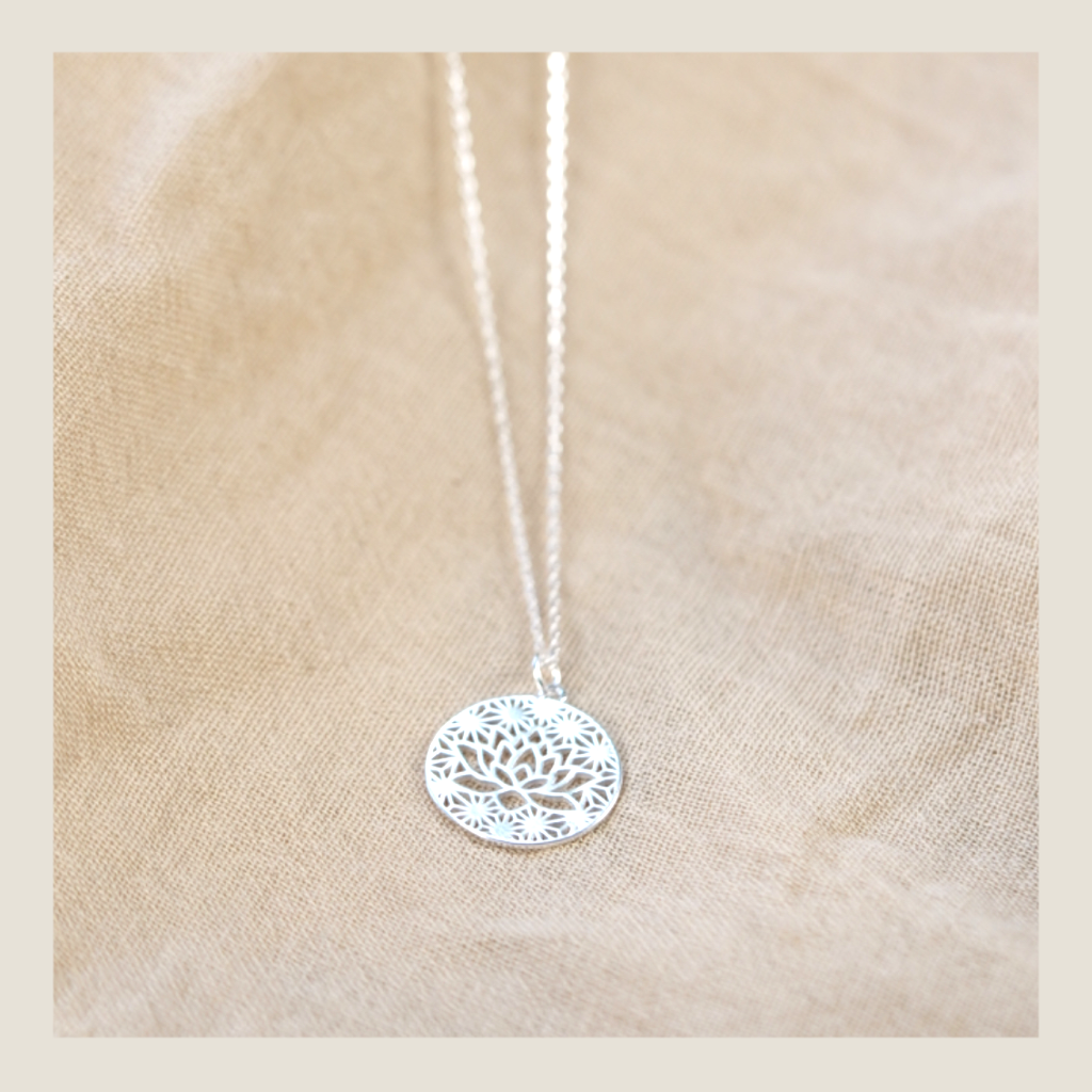 Collar con medalla de diseño mandálico que se apoya sobre el pecho como recordatorio de intención y propósito diario.