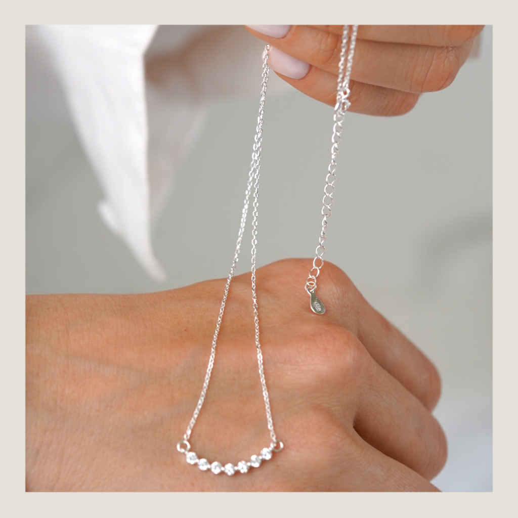 Collar con una curva de cristales en el frente. Para cuando querés que tu escote se llene de luz y darle una sensación de expansión a tu presencia.