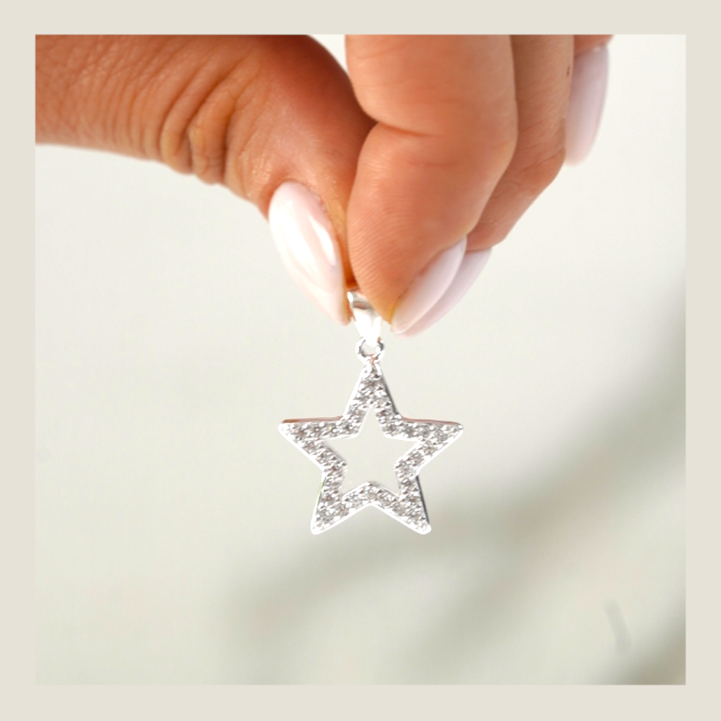 Dije de estrella amplia con brillos delicados en la superficie. Una invitación a ocupar tu lugar y a recordar que tu presencia también ilumina.