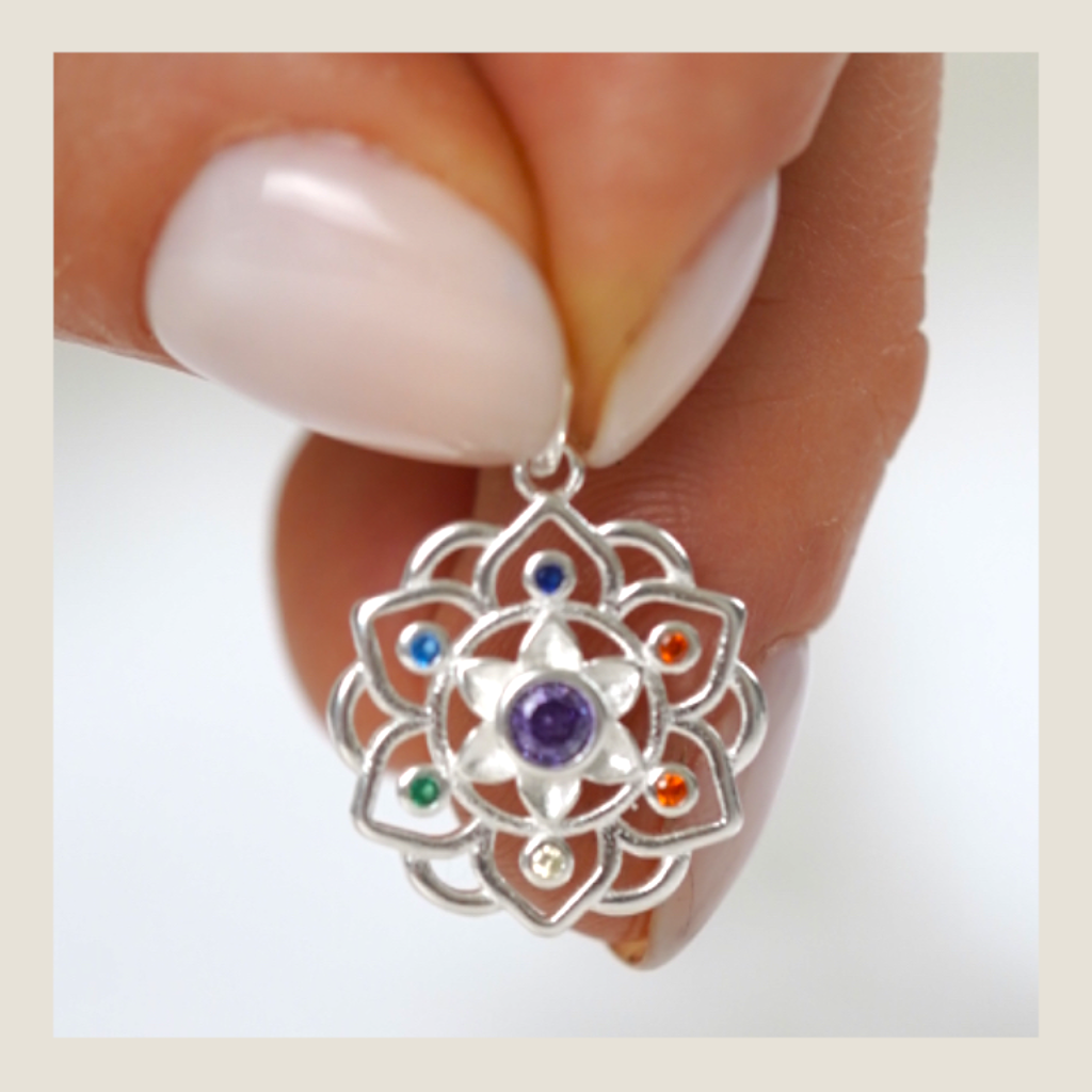 Dije circular tipo mandala con centro violeta y pequeños destellos de color alrededor. Inspirado en la energía de los chakras, ideal si buscás equilibrar intención y belleza en un solo gesto.