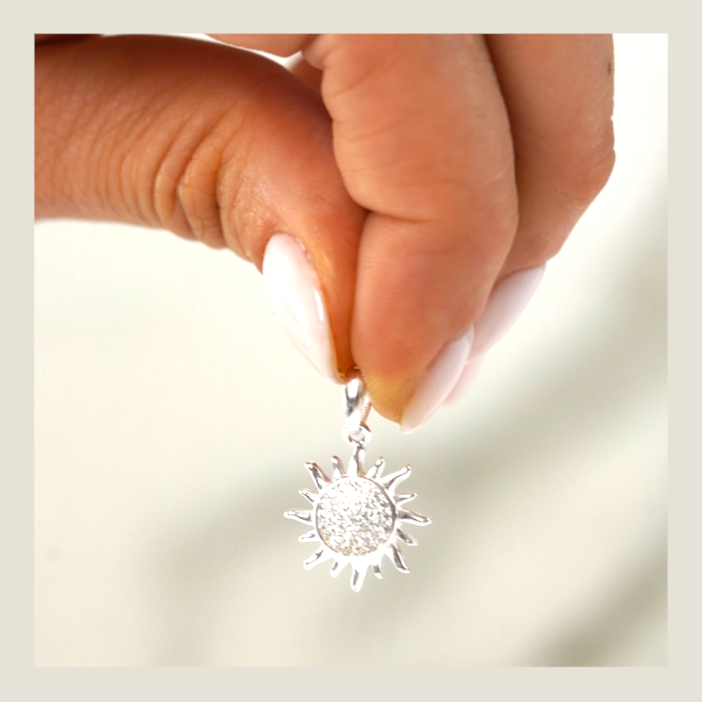 Dije de sol con brillos que nacen desde el centro hacia los rayos. Invita a conectar con tu vitalidad y a llevar cerca del corazón esa parte tuya que se anima a brillar un poco más.