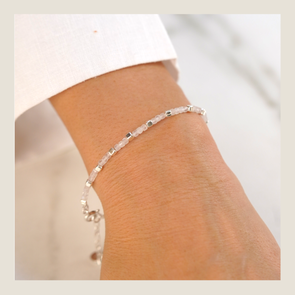 Pulsera fina de pequeñas esferas claras que se siente ligera y versátil, ideal para usar sola o en capas.