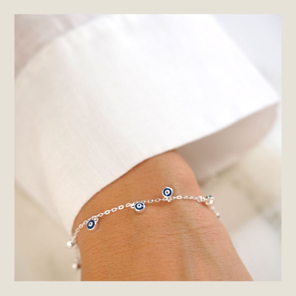 Pulsera con cuentas pequeñas y detalles azules distribuidos en todo el contorno. Ideal si querés sumar color de forma sutil, como un cielo estrellado en miniatura.