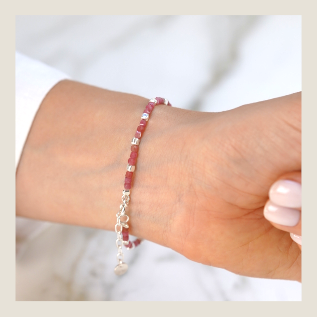 Pulsera de piedras en tonos bordó que aportan calidez, arraigo y una elegancia silenciosa a la muñeca.